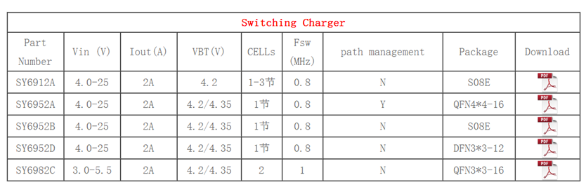 >>美国硅力杰的开关充电产品,包含同步降压开关充电和同步升压开关充电两种。同步降压开关充电方案较多,主要有1-3节的SY6912A和带路径管理和不带路径管理的单节的SY6952。其中,SY6952系列,带输入自适应功能,可以根据充电器能提供的充电电流,调整IC的充电电流,防止充电器被拉死的现象。 同步升压开关充电的SY6982C,应用于给2节串联电池升压充电的管理IC。采用同步升压架构,不仅可以实现升压充电,且充电效率较高,常应用于数码相机和移动电源等两节电池串联升压充电的场合。